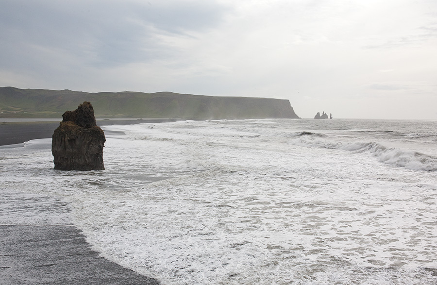 View from Dyrholaey northeast to Vik, showing Reynisdrangar, the spiky basalt sea stacks formed when two trolls were unable to land their three-masted ship before dawn and thus turned to stone by the sunlight.