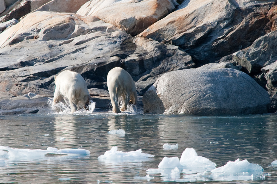 Bears leaving water, Napassorssuaq Fjord, East Greenland