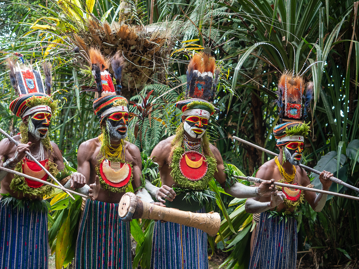 Melpa men performing a "singsing," moving in a mesmerizing rhythm to the tempo of their kundu drums.