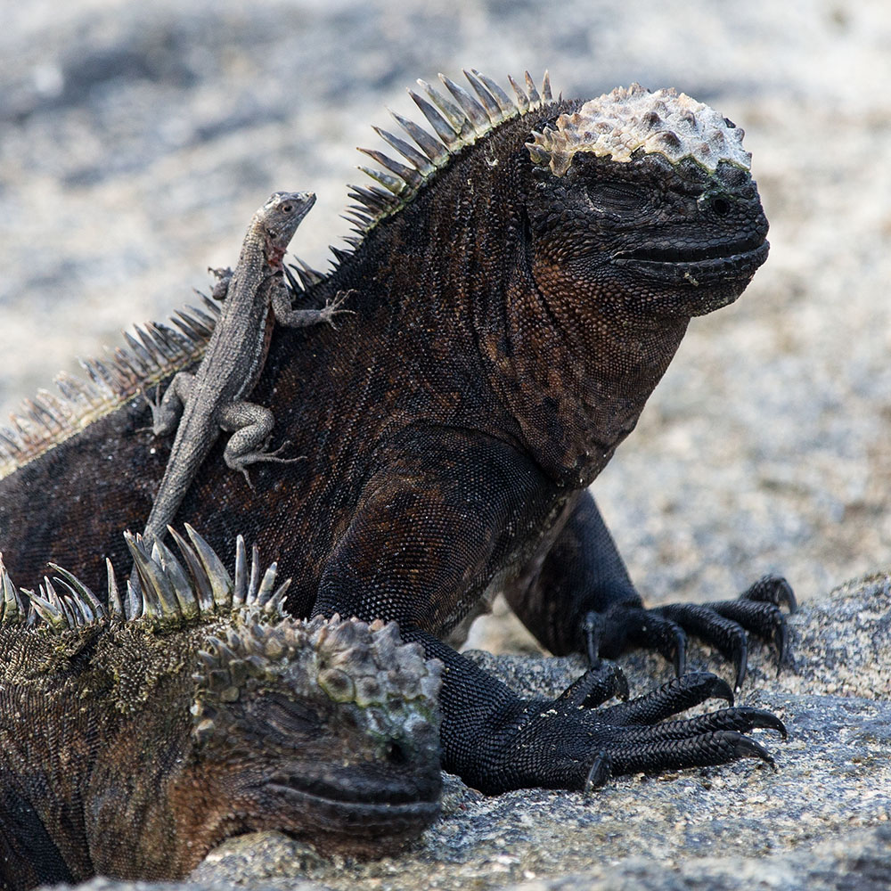 Lava lizard on back of marine iguana.